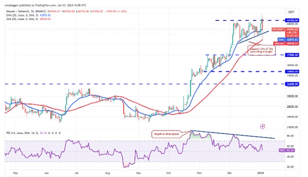 买家在 50 日简单移动平均线(40,938 美元)下跌时买入,表明多头正在大力捍卫 40,000 美元的水平。趋平的 20 天指数移动平均线(42,855 美元)和中点附近的相对强弱指数 (RSI) 表明近期将出现区间波动。该范围的边界可能是 40,000 美元到 45,879 美元。
