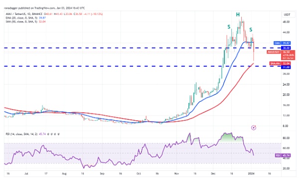 1 月 3 日抛售加速,AVAX/USDT 货币对跌破 38 美元支撑位。这一走势完成了看跌的头肩形态,标志着修正阶段的开始。