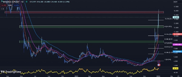 持续的积极势头凸显了看涨情绪,但交易者应留意势头放缓的迹象。在反弹至 2022 年 4 月以来的**水平后,ICP 价格目前面临 15.422 美元至 15.862 美元之间的阻力。该区域与 Fib 0.618 水平一致,增加了其重要性。如果ICP能够突破该区域,则可能为进一步上涨打开大门。