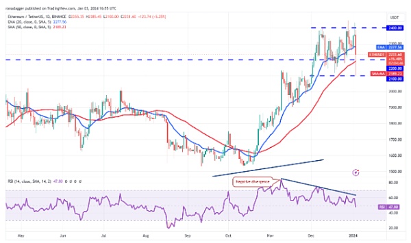 过去几天的价格走势表明,ETH/USDT 货币对可能会在 2,100 美元至 2,400 美元之间波动一段时间。空头必须将价格压低至 2,100 美元以下,才能开始进一步回调至 1,900 美元。从好的方面来说,升破 2,445 美元可能为反弹至 3,000 美元打开大门。