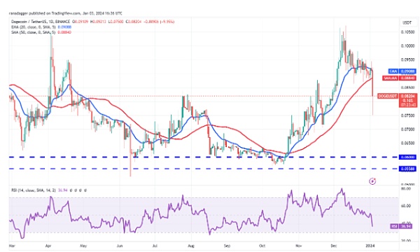 多头正试图开始缓解反弹,但他们的尝试可能会面临 20 日均线(0.09 美元)的强劲抛售。如果价格从 20 日均线下跌,DOGE/USDT 货币对可能会跌至 0.07 美元。这一水平可能会吸引买家,但如果空头占上风,该货币对可能会跌至 0.06 美元。