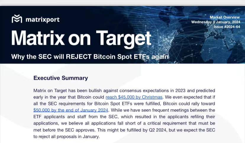 实际上,市场对Matrixport操纵市场的怀疑似乎并非空穴来风,因为恰好在前(2)日,Matrixport才刚对SEC通过比特币现货ETF抱有极大的乐观判断,一月上看5万美元。下面让我们来看看Matrixport接连两日发布的预测报告有何不同: