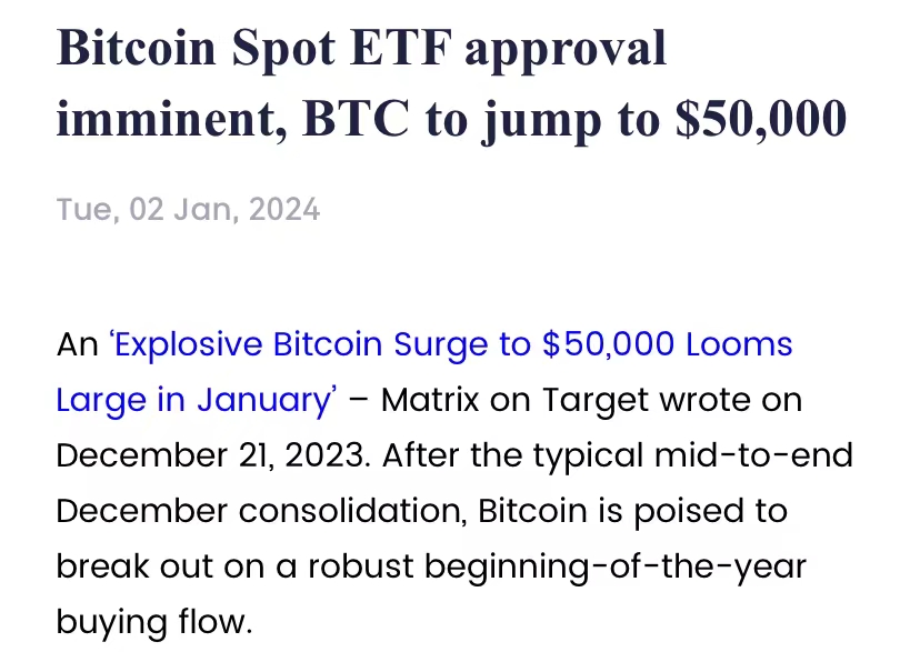 1月2日:《比特币现货ETF即将获批,BTC将跃升至50,000美元》
