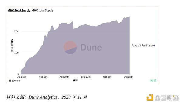 作为**的借贷协议*,总锁定价值(TVL)达 56.4 亿美元的 Aave 推出了超额抵押稳定币 GHO。因此,Aave v3 协议支持的所有**都可以作为 GHO 的抵押品,并且这种抵押品将继续在借贷协议内产生收入。自 7 月推出以来,GHO 的累计 TVL 已超过 2000 万美元。