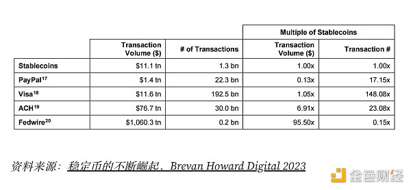根据Brevan Howard 的研究报告,2022 年,稳定币的链上结算量达到 11.1 万亿美元,超过 PayPal 的 1.4 万亿美元,与 Visa 的 11.6 万亿美元相当。这凸显了稳定币在支付领域的巨大潜力,特别是在提供**的链上结算系统方面。而且,在支付和银行系统不发达的发展**家,稳定币的应用尤为关键,满足了对**、低成本支付解决方案的需求。因此,稳定币在全球金融生态系统中发挥着越来越重要的作用,特别是在促进金融普惠性和经济增长方面。