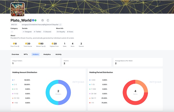 这里我们通过接口 Collection Holding Period Distribution "/v2/statistics/period/distribution/{contract_address}"主要返回一个 NFT Collection 的持有期分布信息,可参考 PlatON 链上 NFTScan Holding Period Distribution: