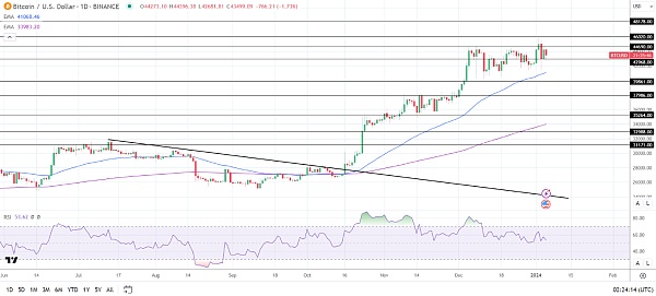 比特币上破44000美元后坚守阵营,加密市场逐渐恢复对于美国证监会(SEC)即将批准美国首支比特币现货ETF成功发行的信心。