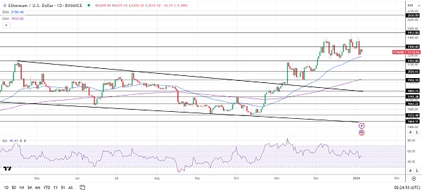 14周期每日RSI为48.41,表以太坊在进入超卖区域之前会跌破 2,143 美元的支撑位。