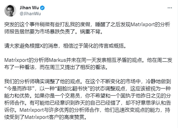 据悉Matrixport是比特大陆投资的一个理财投资平台。1月4日,比特大陆创始人吴忌寒回应道,Matrixport观点并非引起市场恐慌性下跌的原因。