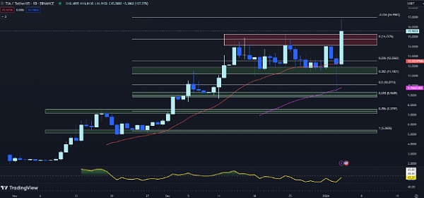 Celestia **(TIA)今天价格大幅上涨,TIA 价格上涨近 40%,达到 16.8135 美元的历史新高。这次突破是在 TIA 经过三周的盘整之后出现的,这表明决定性的上涨可能已经开始。