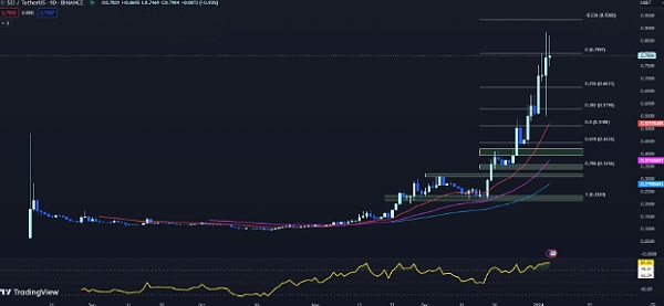 在昨天创下 0.8828 美元的历史新高后,SEI 价格今天迄今为止已在 0.79 美元的水平附近盘整。由于加密货币目前处于超买区域一段时间,SEI 价格可能会出现回调。SEI 价格的 20 天均线为 0.5211 美元,远低于 0.37387 美元的 50 天均线。这表明短期内有强劲的看涨趋势。此外,EMA 之间的差距与超买 RSI 相结合表明未来可能出现波动。