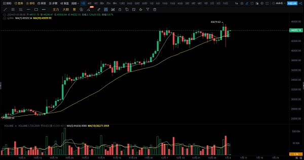 大饼在昨天白天经过短暂的修整以后,下午开始在小时级别小碎线的往上涨,在晚间10点,两根1小时级别的阳线突突上44000,目前大饼需要再进行一波调整,回踩1小时级别的趋势线,然后会继续往上走一走,逢低做多。
