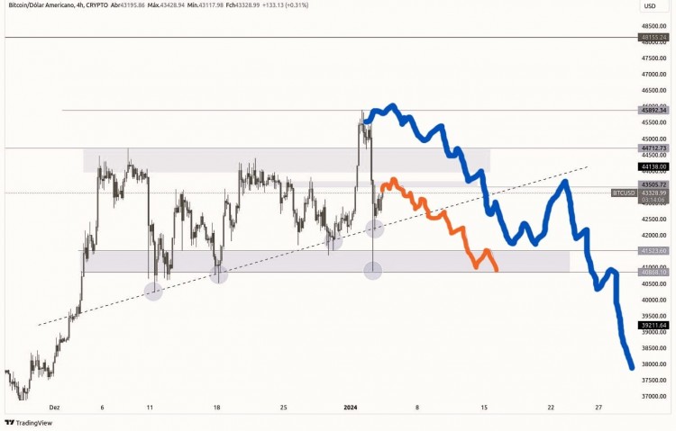 CRITICAL UPDATE: BEARS HOLDING STRONG AT 40,870! Update: Yesterday brought a significant drop, perfectly aligning with my expectations. The price found support at $40,870, precisely where I had drawn the gray support line. Today, we're in the region I anticipated after the jump. It's crucial for the Bears to maintain the price below this level, allowing for a retest of the dotted line and the support in the green region on the chart. As expected, with the price drop, sizable BUY orders around $40,800K/41K were activated. Today, orders are accumulating at approximately $40,000, signaling a downward trend. Noteworthy, large SELL orders at $46K shifted to around $44,700, aligning with a reasonable retest point. Let's keep observing and, most importantly, stay HUMBLE—avoid opening SHORT positions arbitrarily anywhere on the chart!/Update Stay safe and vigilant in the crypto realm! A **all LIKE and FOLLOW, Motivates me a lot