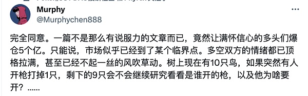 在这种市场极度看涨比特币的大背景下,市场已经到了某个关键的临界点,正如 Murphy 所说:多空双方情绪都已经顶格拉满,甚至已经不起一丝的风吹草动,而 Matrixport 的研究报告,也只不过是起到了催化剂的作用。