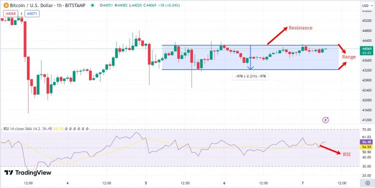 通过对 1 小时 BTC/USD 图表的深入分析,多头面临 44.2 万美元的小阻力,因为比特币价格仍在区间内波动。