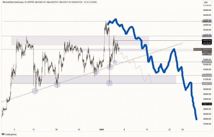 今天,重新测试灰色地带内的 43,500 美元支撑位,这对公牛来说是一个危险区域,需要做出强**的反应。