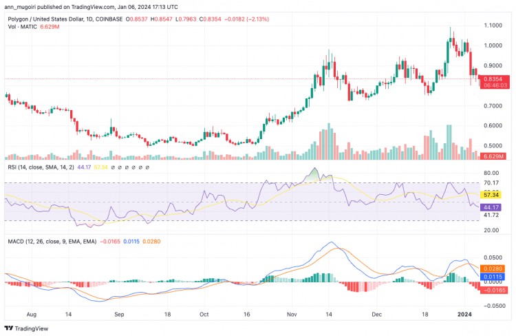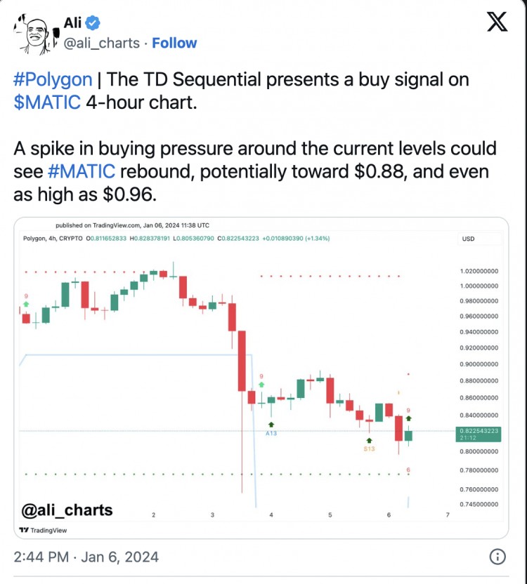 与追随者分享了他的乐观看法,认为 Polygon 可能会在 2024 年 1 月底之前重新回到 0.96 美元的水平。当前水平购买压力的增加可能会将 MATIC 推至 0.88 美元,甚至 0.96 美元。