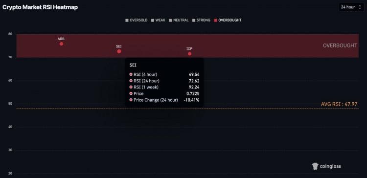 Sei Network 是另一种下周避免交易的加密货币,其每周 RSI 为 92.24,处于极度超买状态。