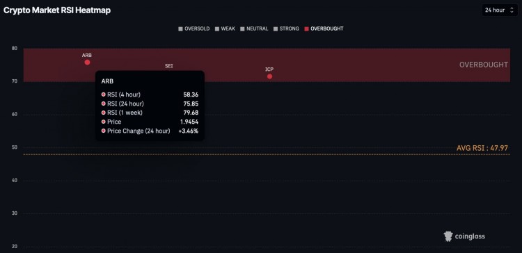 Arbitrum 的**在每日和每周 RSI 中处于超买状态,分别为 75.85 点和 79.68 点。