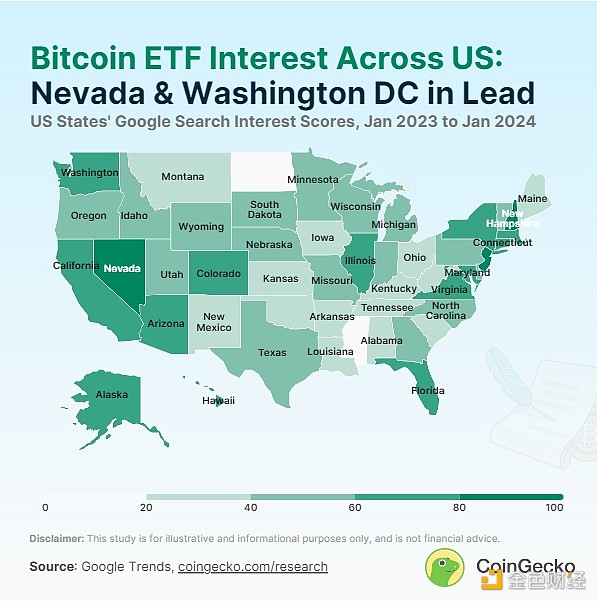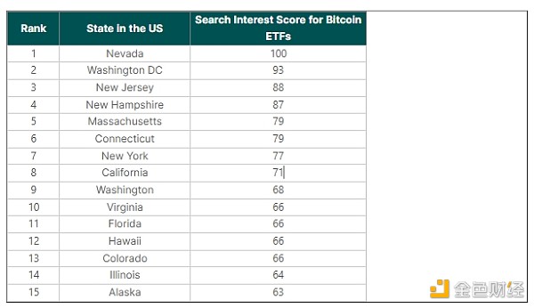 尽管是美国的金融和技术**,但在**比特币 ETF 兴趣中,纽约排名第七,加利福尼亚排名第八。 密西西比州和北达科他州是对比特币 ETF 最不感兴趣的州,得分**,均为 19 分。
