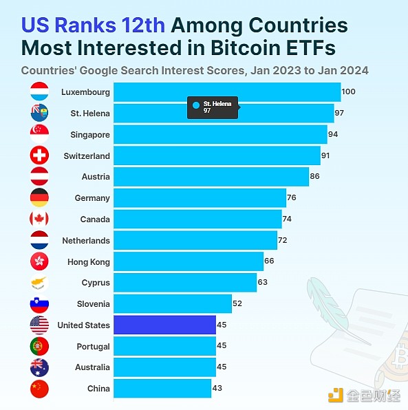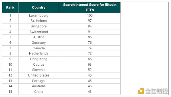 卢森堡、圣赫勒拿、新加坡和瑞士**全球对比特币 ETF 的兴趣,谷歌趋势上的搜索兴趣得分位于第 90%。