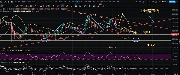现在是北京时间2024.1.8上午9:58分。当前ETH价格在2207附近。看下日线级别走势,当前价格K线有布林带上轨下穿至下轨2185附近。盘中**回踩深度叨叨2185,整体走势仍旧难以改观弱势形态,预计盘中可能还会持续冲击下轨支撑2185甚至跌破。RSI当前有中轨线50值附近反转向下,证明盘中向下的势能还会再次扩大化,KDJ 日线指标J线同样三线相交出反转下行。盘中反弹很难压制住下跌的势能,整体操作方向建议反弹承压后顺势去空头操作为主。