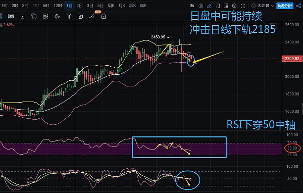 那么当前4小时基本面,价格走势弱势形态较为明显了,如图,当前价格跌破上升趋势线,到达**支撑位2215附近,那当前是否在2215附近能够形成支撑反转吗?我觉得可能性不大,因为4小时RSI指标趋势线当前下行穿过中轴50值到达了25附近空头区间,那么相应的做空势能仍将深化,即使盘中没能出现放量杀跌连续破位下行的形态。也是反弹无力窄幅震荡走低。下方2150附近恐有破位到达风险