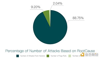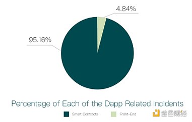 由上图所示,合约、后台和前端受攻击的事件比例分别为95.16%、0%和4.84%。在总共124起事件中,6起为前端受攻击,118起为合约受攻击。