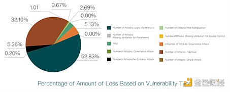 由上图可知,逻辑缺陷造成的损失金额在所有类别中排**,53起安全事件造成了2.86亿美元的损失,占总金额的比例为52.83%;私钥泄漏造成的损失排第二,6起事件造成了1.74亿美元的损失,占比32.1%;重入攻击造成的损失金额排第三,10起安全事件造成了2906万美元的损失,占比5.36%。