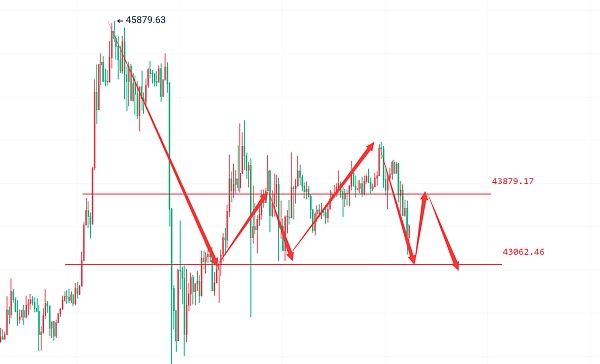 比特币周线收取阳线之后价格有**的下跌,且周线头多力量有明显放缓,整体周线并不是非常的乐观。日线在震荡下跌三连阴之后,早盘时间段就开始放量下跌,KDJ三线交叉向下形成死叉,日线空头力量加速运行,日内还有进一步试探底部支撑43000左右。短线四小时上布林有开口迹象,43800已经形成顶底转换,空单布局处理建议关注这个位置。一小时上短线boll开口价格运行在下跌通道之中,下方支撑建议关注42900处理,多单不布局建议关注这个位置。综合上述比特币日线建议区间操作为主。