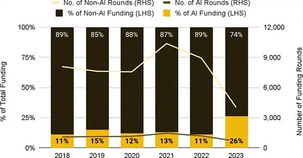 人工智能行业在 2023 年的投资者兴趣方面也表现强劲。尽管融资金额总体减少,但人工智能在美国创业融资中的份额相对增长了 230%,约占 26%。这一增长发生在人工智能和非人工智能领域都经历了资金低迷的背景下。然而,与整体市场相比,人工智能表现出了特别的弹性。
