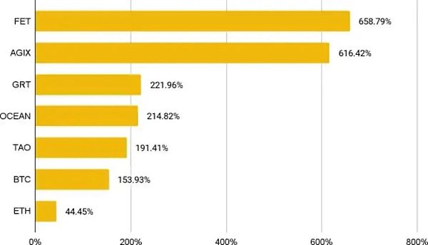 2023 年,市值排名前五的 AI **的表现明显优于 BTC 和 ETH,涨幅从 200% 到高达 650% 不等