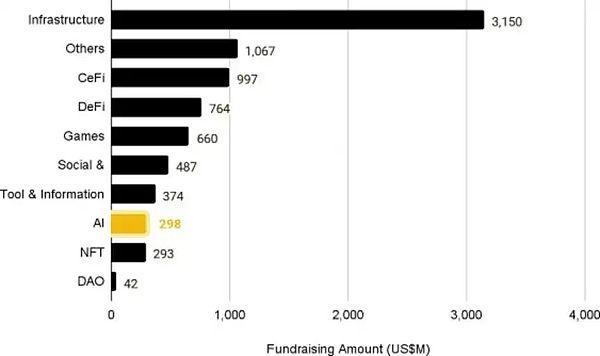 2023 年人工智能项目的资金为 2.98 亿美元,排名第 7,占 Web3 项目总资金的 3.7%