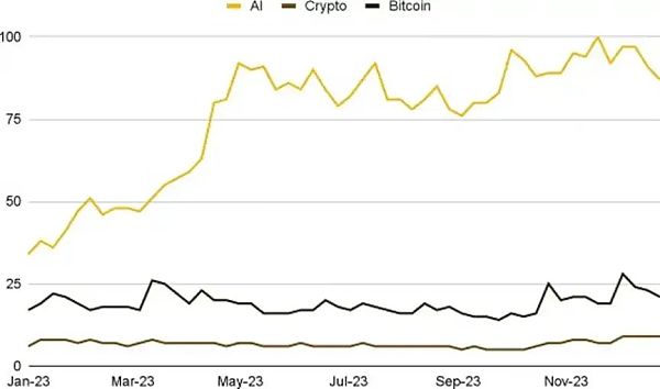 谷歌对人工智能的搜索兴趣在 2023 年大幅上升,大大超过了「加密」和「比特币」。