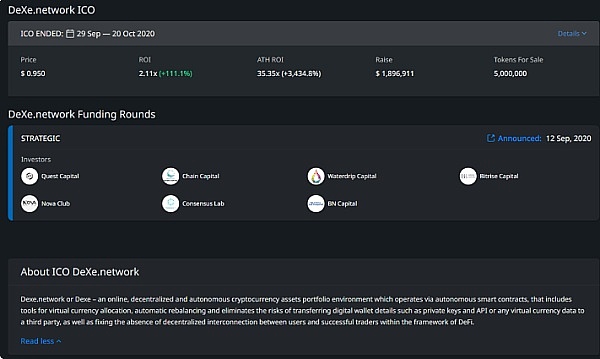 根据分析工具 Cryptorank.io 的数据,DeXe 在 2020 年 9 月至 10 月期间进行了 ICO,成功筹集了 180 万美元。一个月前,该公司完成了一轮私人投资,但筹集的资金总额仍未披露。