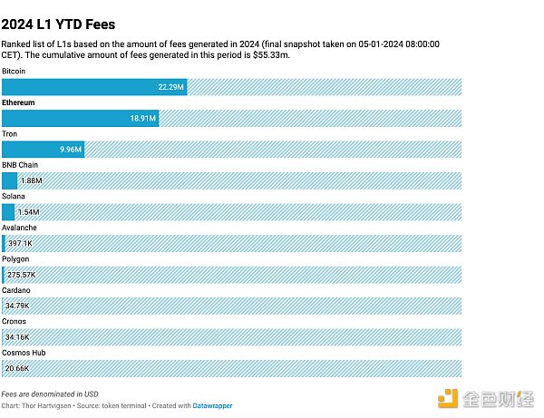 在费用产生方面,仅以太坊就占到 2023 年 L1 产生的总费用的 50% 以上。它的主导地位现在已经减弱,这主要是由于铭文热潮之后比特币生态系统的出现。