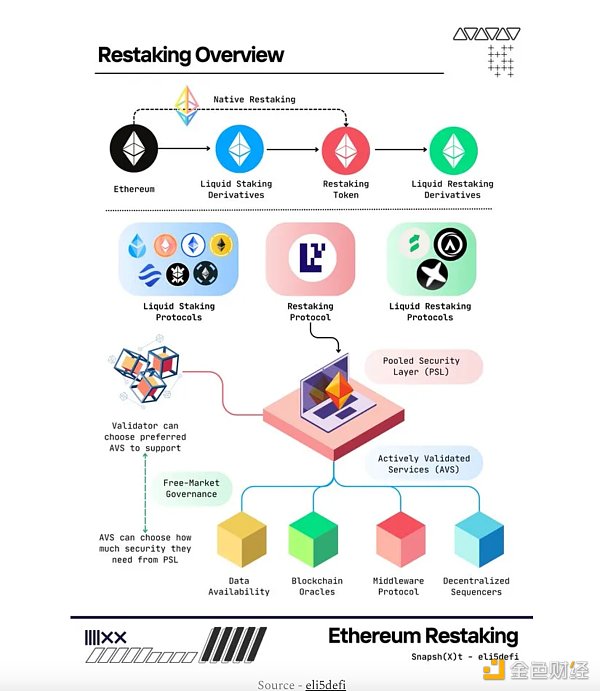 重新质押 (Restaking) 是 EigenLayer 引入的一个新颖概念,服务可以通过它利用以太坊的安全和共识机制。EigenLayer 是一个连接 ETH 重新质押者和 "积极验证服务" (AVS) 的市场平台。AVS 可以是**类型的服务,从预言机网络到侧链再到桥接,都希望继承以太坊的安全性。ETH 质押者可以通过重新质押他们的 ETH 将其委托给 AVS,从而获得更高的质押收益。本质上,ETH 质押者除了块验证之外,还可以参与数据存储、计算或其他额外的服务。