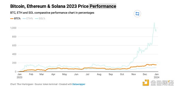 令人惊讶的是,比特币在2023年底几乎翻倍,而Solana短暂地触及了四位数的回报率。
