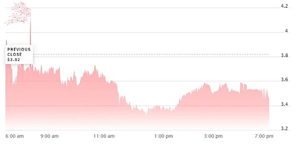 受此消息影响,纳斯达克股票交易所的数据显示,Argo (ARBK)股价瞬间暴跌 8.6%,至 3.36 美元,导致该公司市值跌至 1.837 亿美元。