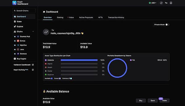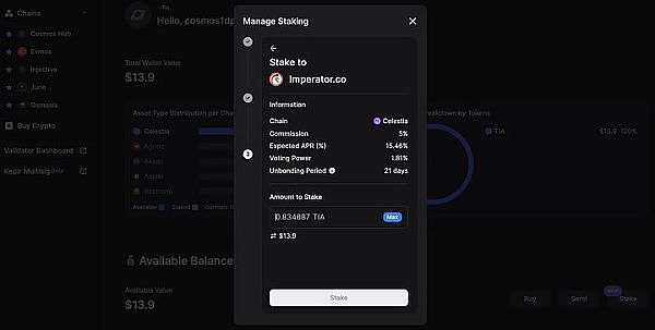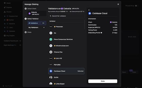目前要在Co**os生态上进行质押非常简单,只要在把相关**提到支援Co**os 生态的钱包Keplr Wallet或Leap Wallet内,即可直接在钱包介面内进行质押,将你的**委托给验证者,赚取APR 和潜在的空投机会。