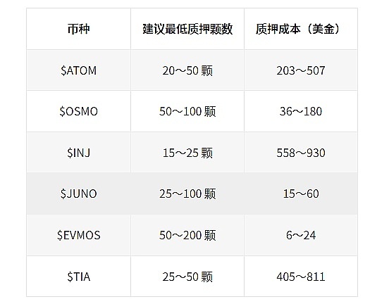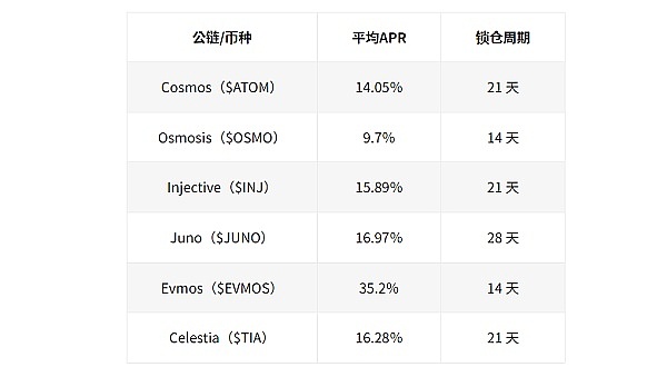 各链质押提供的APR 会根据不同的验证者有些微的不同,需要注意的是不同币种有不同的**锁仓时限,以下是各个币种平均的年化报酬表现和锁仓时间。