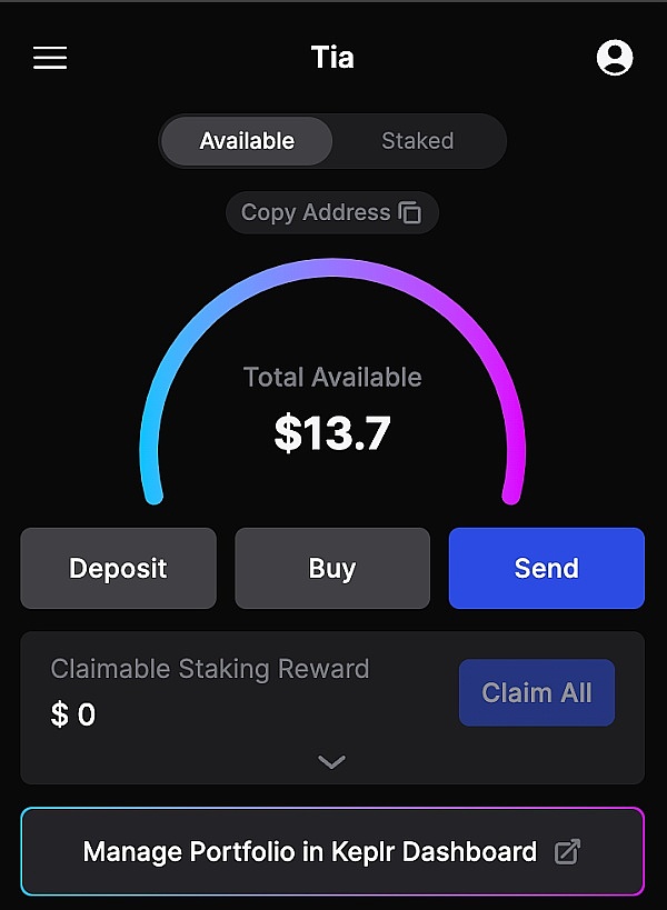 进入钱包页面后,选择「Deposit」就能取得钱包地址,可以从交易所将你想要质押的币种提入你的钱包。确认钱包里有**后,点选「Stake with Keplr Dashboard」,开始进入质押流程。(建议使用电脑操作)