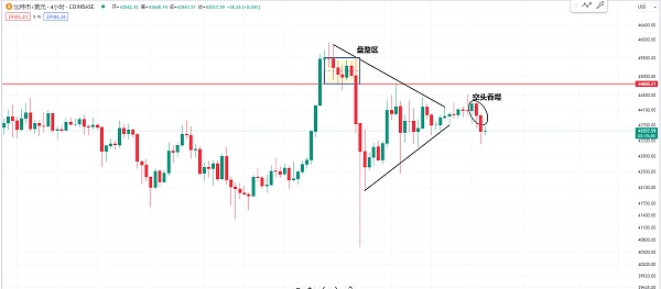 特别是4小时级别我也是有看到了有一个收敛三角的形态 然后昨天他突破的时候 又没有把上面这个盘整区的压力位给突破 现在没有突破 那4小时级别又是收了一个空头吞噬 那会这样跌下去吗