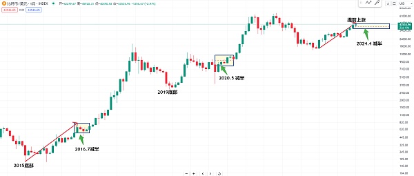 然后我们再来看一下比特币的月线级别 那比特币每一次产量减半 他底部会提前一年上涨 然后涨了一年之后有可能在减半的前后两个月到三个月的时间他有可能会箱体盘整