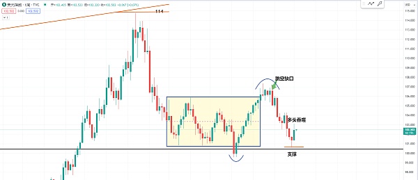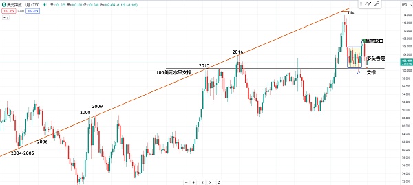所以我们回到图表当中来观察 就是最近的美元指数的周线级别是收了一个非常强势的多头吞噬 那这个低点的位置有一个支撑
