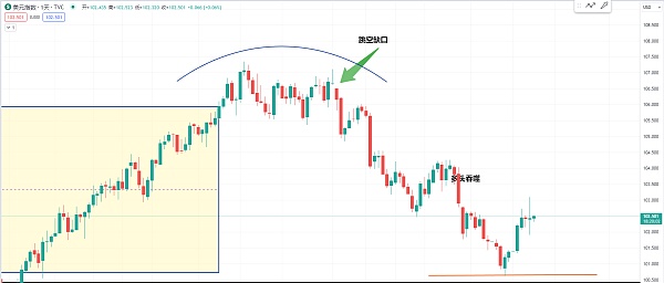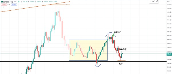 我们先来看一下美元指数的日线级别 我记得在去年十月份的时候我是有给大家说过美元指数在这个位置有一个非常强势的看空形态 三根K线组合起来是一个夜星 或者是这边又有一个跳空缺口