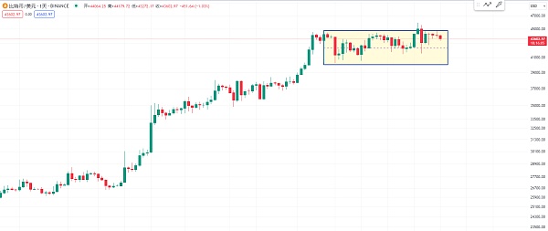 所以我们再回到比特币的日线级别 那如果中期比特币如果是在盘整 我的观点是我们先观察这个箱体 如果高点的位置压力要突破的话就需要尽快 那如果没有上破的话还是会箱体震荡