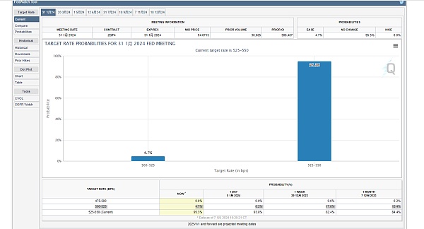 那我们再来观察一下美联储利率预测器 我们可以看一下降息的预期本来在上周或者是之前还有18% 然后就在这两天降息预期是在下降 只有6.2% 然后到现在的降息预期只有4.7% 或者是不加息的预期目前是95%