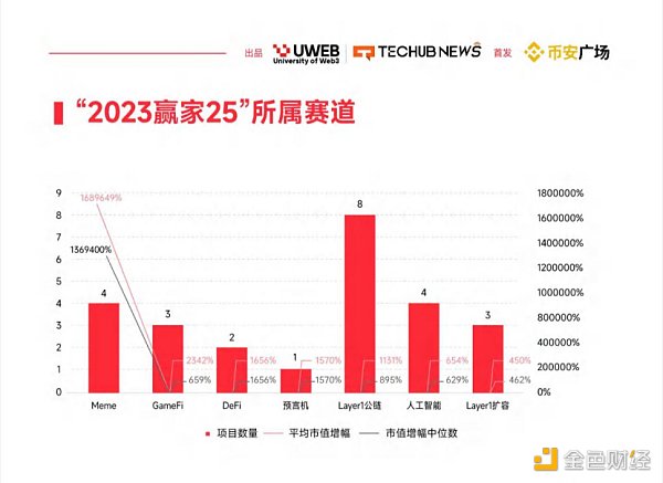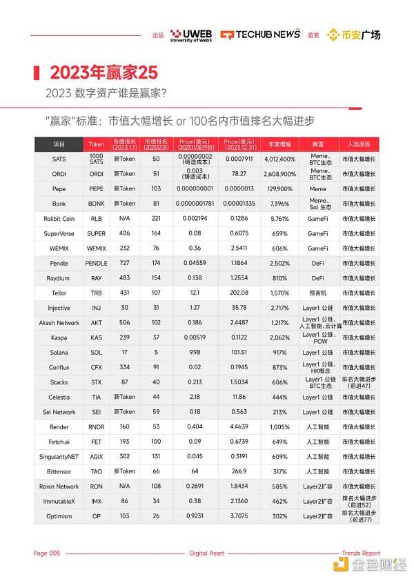 “2023数字资产赢家25”指数的诞生反映了数字资产市场的多样性和活力。从Meme到DeFi,从GameFi到Layer1公链,从Layer2扩容到人工智能,再到预言机、BTC生态和Solana生态,这一指数涵盖了各个领域的代表性项目。这不仅突显了Web3.0生态的广度,还展示了数字资产市场在不同方向上的创新性。