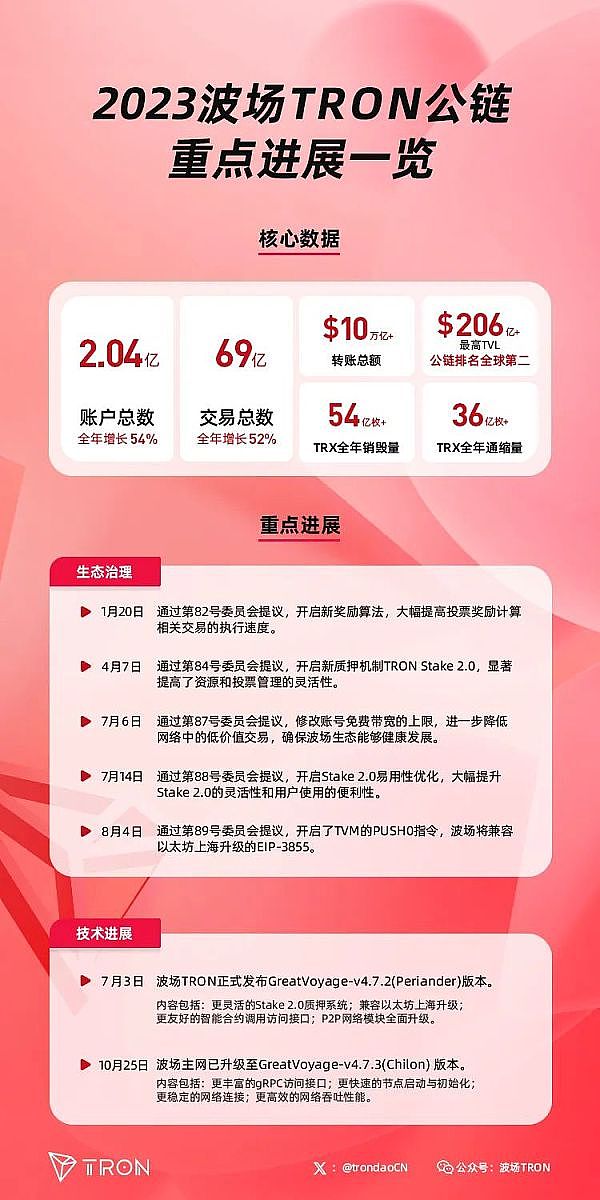 链上数据的繁荣离不开波场TRON的底层区块链技术加持。2023年,波场TRON加码生态治理创新与技术升级,在另一个层面继续为长期主义夯实基础。